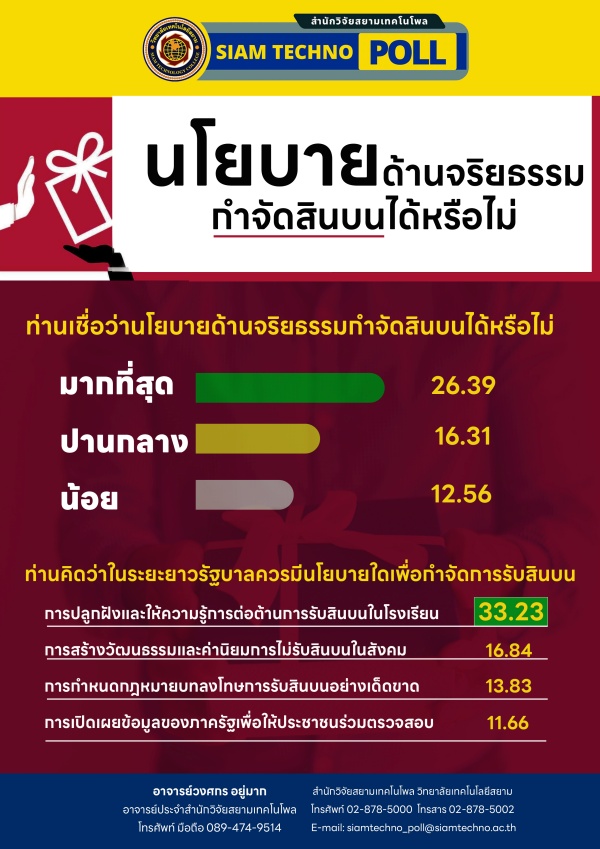 สำนักวิจัยสยามเทคโนโพล วิทยาลัยเทคโนโลยีสยาม เปิดเผยผลสำรวจของประชาชน เรื่อง “นโยบายด้านจริยธรรมกำจัดสินบนได้หรือไม่” ทำการสำรวจระหว่างวันที่ 23–30 มกราคม 2567 จากประชาชนที่มีอายุ 18 ปีขึ้นไป กระจายทุกภูมิภาค ระดับการศึกษา อาชีพ และรายได้ ทั่วประเทศ รวมทั้งสิ้น จำนวน 1,330 หน่วยตัวอย่าง เกี่ยวกับความคิดเห็นนโยบายด้านจริยธรรมกำจัดสินบนได้หรือไม่ การสำรวจอาศัยการสุ่มตัวอย่างโดยใช้ความน่าจะเป็นจากบัญชีรายชื่อฐานข้อมูลตัวอย่างหลัก (Master Sample) ของ “สยามเทคโนโพล” สุ่มตัวอย่างแบบหลายขั้นตอน (Multi-Stage Sampling) เก็บข้อมูลด้วยวิธีการสัมภาษณ์ทางโทรศัพท์ และโปรแกรม Google Form โดยกำหนดค่าความเชื่อมั่น ร้อยละ 95.00
