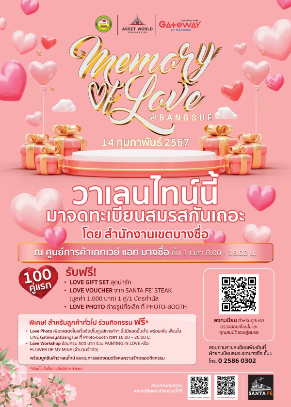 เกทเวย์ แอท บางซื่อ ร่วมกับ สำนักงานเขตบางซื่อ จัดงาน ‘Memory of Love @Bangsue’ ชวนคู่รักมาจดทะเบียนสมรสนอกสถานที่ ฉลองวาเลนไทน์ พิเศษ 100 คู่แรกรับ Gift Voucher Santa Fe’ Steak คู่ละ 1,000 บาท และของที่ระลึกสุดประทับใจ