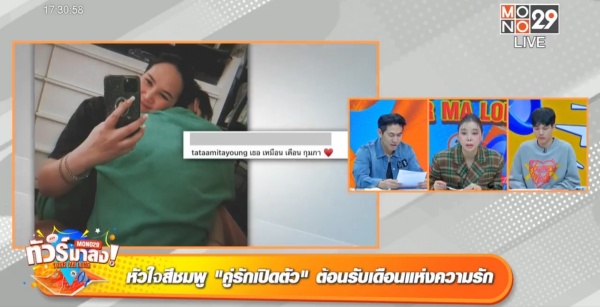 ในวันจันทร์ที่ 5 กุมภาพันธ์ ต้อนรับเดือนแห่งความรักพาไปเช็คคู่หวานในวงการล่าสุดพิธีกร ซานิ เล่าข่าวเริ่มว่าเริ่มที่นักร้องตัวแม่ ทาทา ยัง โพสต์ภาพหวานเปิดตัวหนุ่มหล่อปริศนา พร้อมแคปชั่น “เธอเหมือนเดือนกุมภา” โดยเมื่อปลายปีที่แล้ว ทาทา เคยให้สัมภาษณ์ว่ามีคนคุยเป็นหนุ่ม อายุ 21 ปี ซึ่งอายุห่างกับนักร้องสาวถึง 21 ปีเลยทีเดียว