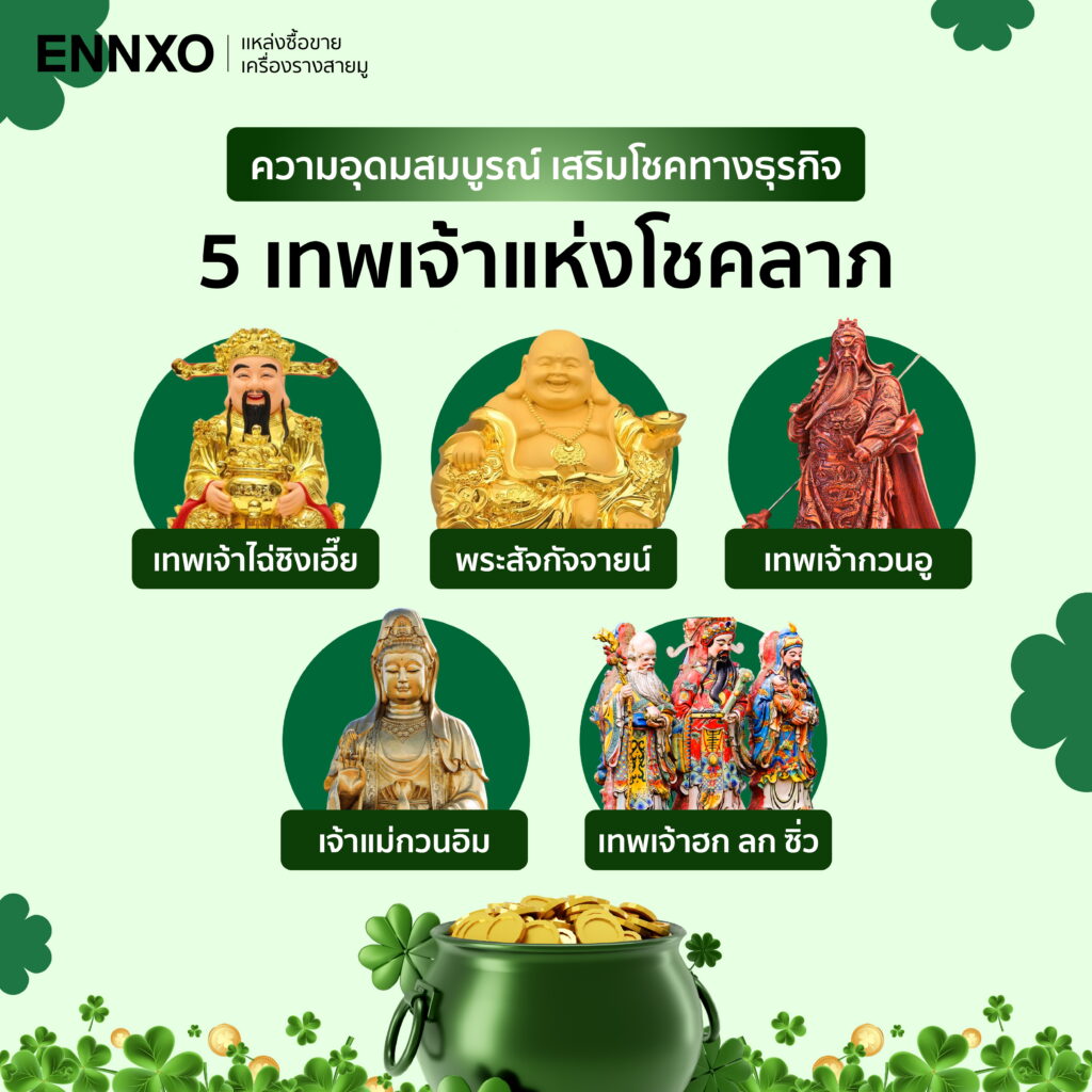 ทั้งหมดนี้คือ เทพเจ้าแห่งโชคลาภทั้ง 5 ที่ ENNXO ได้รวบรวมมาให้เพื่อให้ชาวสายมู เจ้าของธุรกิจ หรือพ่อค้าแม่ค้าออนไลน์ได้บูชาเสริมโชคลาภ ขอพรให้ยอดค้าขายพุ่งทะลุเป้า สนับสนุนด้านการขายให้รุ่งเรือง และเพิ่มความมั่งคั่งทางการเงิน