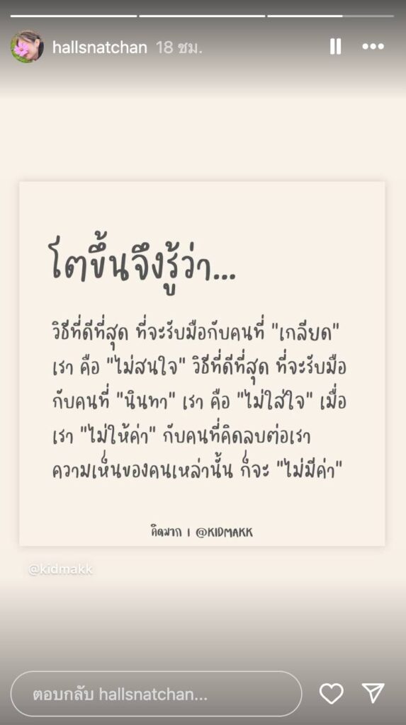ส่วนทางอดีตแฟนสาวก็ออกมาเคลื่อนไหวหลังหนุ่มเป็กซ์โพสต์ โดยแชร์คำคมที่อ่านแล้วทำเอาสะดุ้งเลยว่า “โตขึ้นจึงรู้ว่า…วิธีที่ดีที่สุด ที่จะรับมือกับคนที่ “เกลียดเรา” คือ “ไม่สนใจ” วิธีที่ดีที่สุด ที่จะรับมือกับคนที่ “นินทา” เรา คือ “ไม่ใส่ใจ” เมื่อเรา “ไม่ให้ค่า” กับคนที่คิดลบต่อเรา ความเห็นของคนเหล่านั้นก็จะ “ไม่มีค่า”