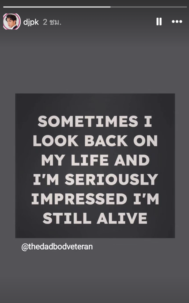 และล่าสุด ดีเจพีเค ได้ออกมาเเชร์ข้อความ ผ่านสตอรี่ โดยข้อความระบุไว้ว่า “SOMETIMES I LOOK BACK ON MY LIFE AND I’M SERIOUSLY IMPRESSED I’M STILL ALIVE”