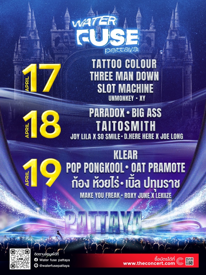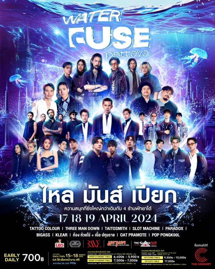 คอนเสิร์ตแห่งปีที่ทุกคนรอคอยกับ WATER FUSE ครั้งที่2 กลับมาจัดงานอย่างเต็มรูปแบบอีกครั้ง เตรียมตัวให้พร้อมสำหรับงานวันไหลของเมืองพัทยา ระเบิดความมันส์ไปกับเหล่ากองทัพศิลปินและดีเจระดับแนวหน้าของเมืองไทย อาทิเช่น TATTOO COLOUR, THREE MAN DOWN, TAITOSMITH, PARADOX, OAT PRAMOTE, POP PONGKUL, KLEAR, SLOT MACHINE, BIGASS, และ ก้อง ห้วยไร่ กับ เบิ้ล ปทุมราช