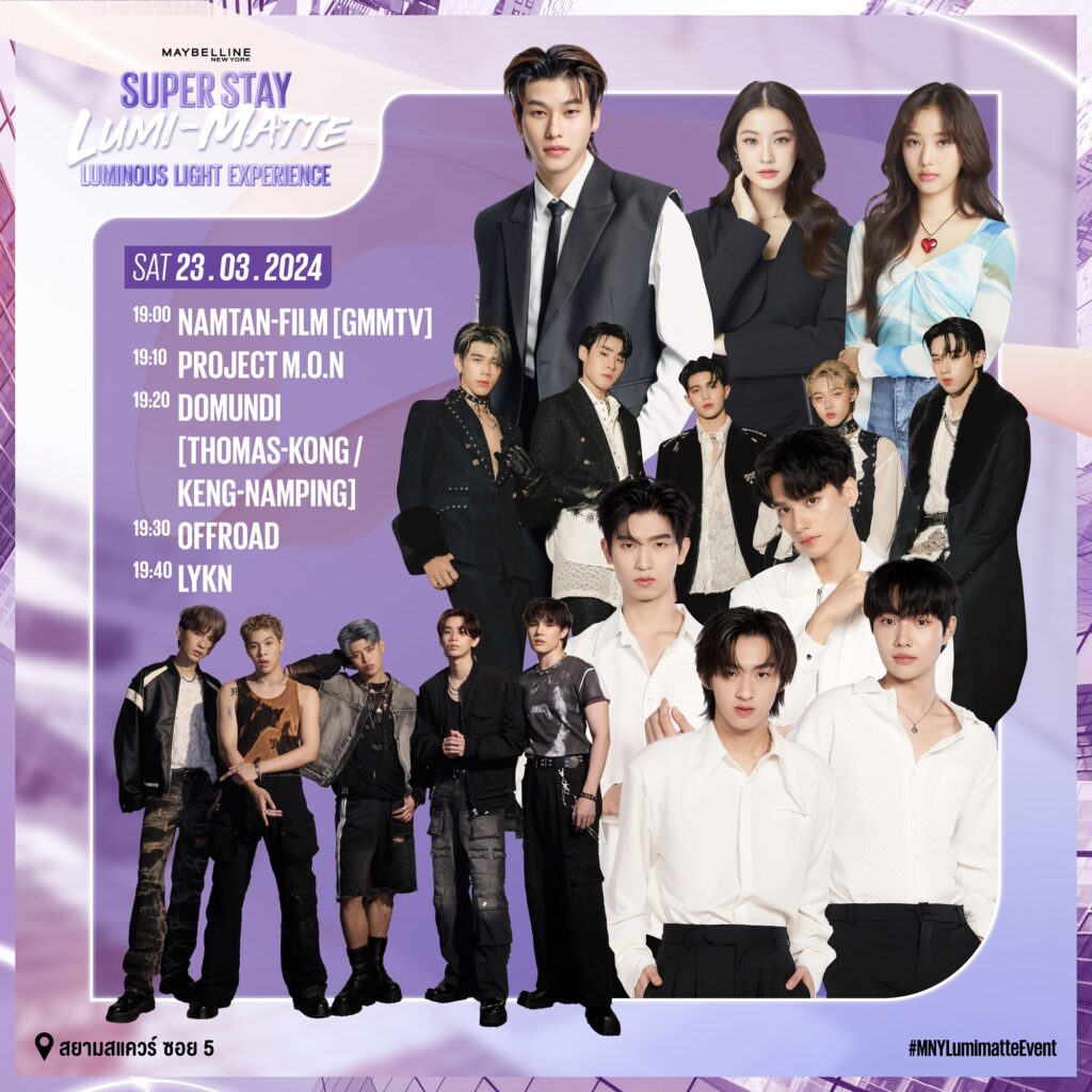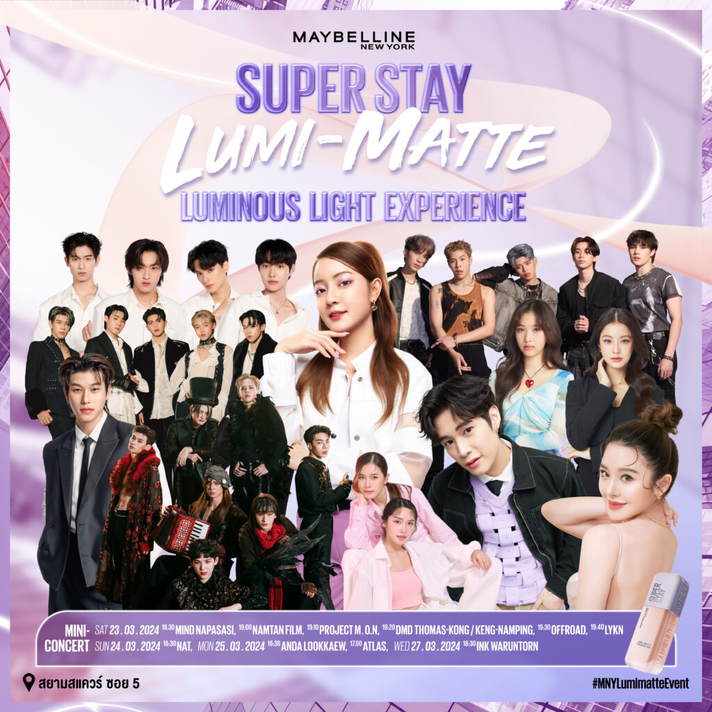 คนเก๋ คนชิค คนเทรนด์ ห้ามพลาด! Maybelline NEW YORK ประเทศไทย เนรมิตพื้นที่ใจกลางกรุงเทพฯ จัด งาน SUPER STAY LUMI-MATTE: LUMINOUS LIGHT EXPERIENCE สร้างปรากฏการณ์ผิวสวยล้อแสง เปิดตัวรองพื้นตัวใหม่ล่าสุด SuperStay Lumimatte ชวนศิลปิน นักแสดง ดารา อาทิ อิ้งค์วรันธร Brand Endorser – SuperStay Lumimatte Campaign พร้อมแก๊งศิลปินและไอดอล Gen-Z แห่งยุคที่ผนึกกำลังมาร่วมปล่อยแสงกันแบบ Day-to-Night นำโดย LYKN, ATLAS, Project M.O.N, ณฐ ณฐสิชณ์, ออฟโรด, โทมัส-ก้อง-เก่ง-น้ำปิง, น้ำตาล-ฟิล์ม, อันดา-ลูกแก้ว และมายด์ ณภศศิ ที่จะมาร่วมโชว์ผิวสวยล้อแสงท่ามกลางแสงไฟ Light Art Installation สุดอลังการและมินิคอนเสิร์ตในทุก ๆ วัน