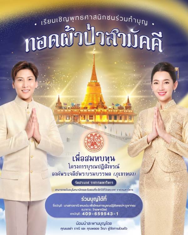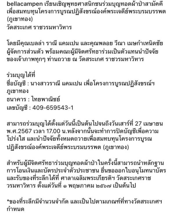 งานนี้สาว “เบลล่า ราณี” จึงถือโอกาสดี ๆ แบบนี้ เรียนเชิญพุทธศาสนิกชนมาทำบุญทอดผ้าป่าสามัคคี โดยร่วมบุญได้ทางชื่อบัญชี: นางสาวราณี แคมเปน เพื่อโครงการบูรณปฏิสังขรณ์ฯ ภูเขาทอง ธนาคาร: ไทยพาณิชย์ เลขบัญชี: 409-659543-1 ตั้งแต่วันนี้เป็นต้นไปจนถึงวันเสาร์ที่ 27 เมษายน พ.ศ. 2567 เวลา 17.00 น. หลังจากนั้นจะทำการปิดบัญชีเพื่อความโปร่งใส และนำปัจจัยทั้งหมดถวายเพื่อสมทบทุนโครงการบูรณปฏิสังขรณ์องค์พระเจดีย์พระบรมบรรพต (ภูเขาทอง)