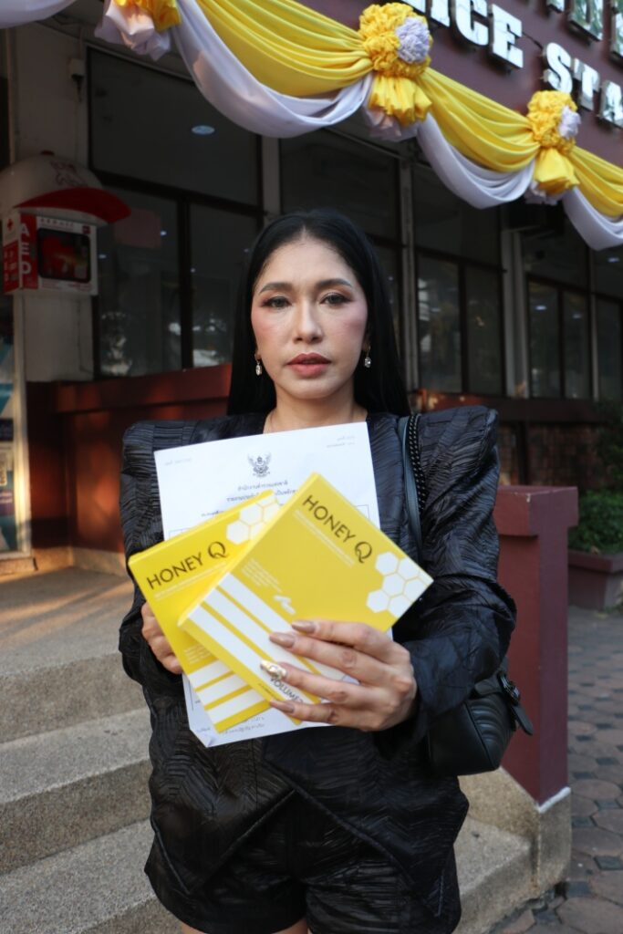 “เป็นประโยชน์กับผู้บริโภคนะคะ เพราะของปลอมมันอันตรายถึงชีวิตเลยนะ มีหลายคนทักเอ้มาเลยว่าใจสั่น บ้านหมุน มึนศีรษะอาเจียน ซึ่งเอ้ไม่เคยเจอเลย แต่ของปลอมเป็นแบบนี้ อันตรายมาก ๆ ถึงมาแจ้งความ เพราะเราไม่รู้เหตุการณ์วันข้างหน้า เกิดมีคนเสียชีวิตขึ้นมาล่ะ เอ้เป็นพรีเซ็นเตอร์ เอ้ก็เสียชื่อนะคะ เอ้ถึงมาแจ้งความ แล้วใครเอารูปเอ้ไปใช้โดยไม่ได้รับอนุญาตเอ้ฟ้องค่ะ ฟ้องจริงค่ะ ฝากบอกลูกค้าถ้าเจอของปลอมแบบนี้ ถ่ายคลิปวิดีโอส่งมาทีบริษัท HONEY Q เราจะแจ้งความส่งผลทางอาญาได้ เพราะเป็นมิจฉาชีพ ล่อลวง โกงลูกค้า อันนี้อันตรายจริง ๆ ค่ะ”