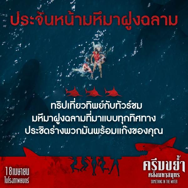 ทริปเกาะสวรรค์ที่จะกลายเป็นทริปหนีนรกโดยไม่คาดฝัน! เตรียมเผชิญหน้าความเป็นความตายกลางมหาสมุทรที่ต้องลุ้นเอาตัวรอดทุกนาทีกับภาพยนตร์แอ็กชันระทึกขวัญแห่งปี “Something in the Water ครีบขย้ำ คลั่งมหาสมุทร” ที่ขอชวนคนใจกล้ามาร่วมฝ่าฝูงฉลามกระหายเลือดที่ซ่อนตัวภายใต้ผืนน้ำอันไร้ขอบเขตรอกระชากเหยื่อผู้เคราะห์ร้ายลงสู่ใต้ทะเลลึกพร้อมขย้ำให้ถึงตาย!