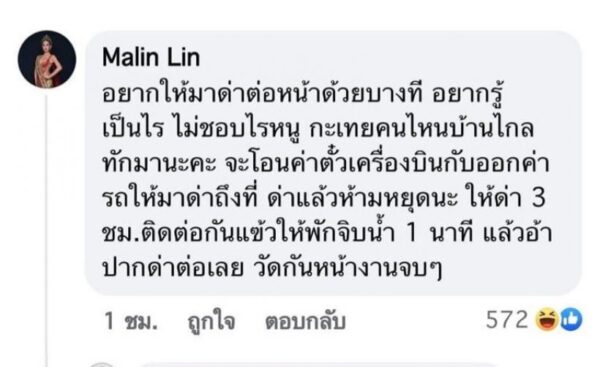 ล่าสุด สาวหลิน ขอพื้นที่ชี้แจงกับพี่กะเทยที่ไม่ชอบ โดยระบุไว้ว่า “อยากให้มาด่าต่อหน้าด้วยบางที อยากรู้เป็นไร ไม่ชอบไรหนู กะเทยคนไหนบ้านไกลทักมานะคะ จะโอนค่าตั๋วเครื่องบินกับออกค่ารถให้มาด่าถึงที่ ด่าแล้วห้ามหยุดนะ ให้ด่า 3 ชม.ติดต่อกันแข้วให้พักจิบน้ำ 1 นาที แล้วอ้า ปากด่าต่อเลย วัดกันหน้างานจบ ๆ”