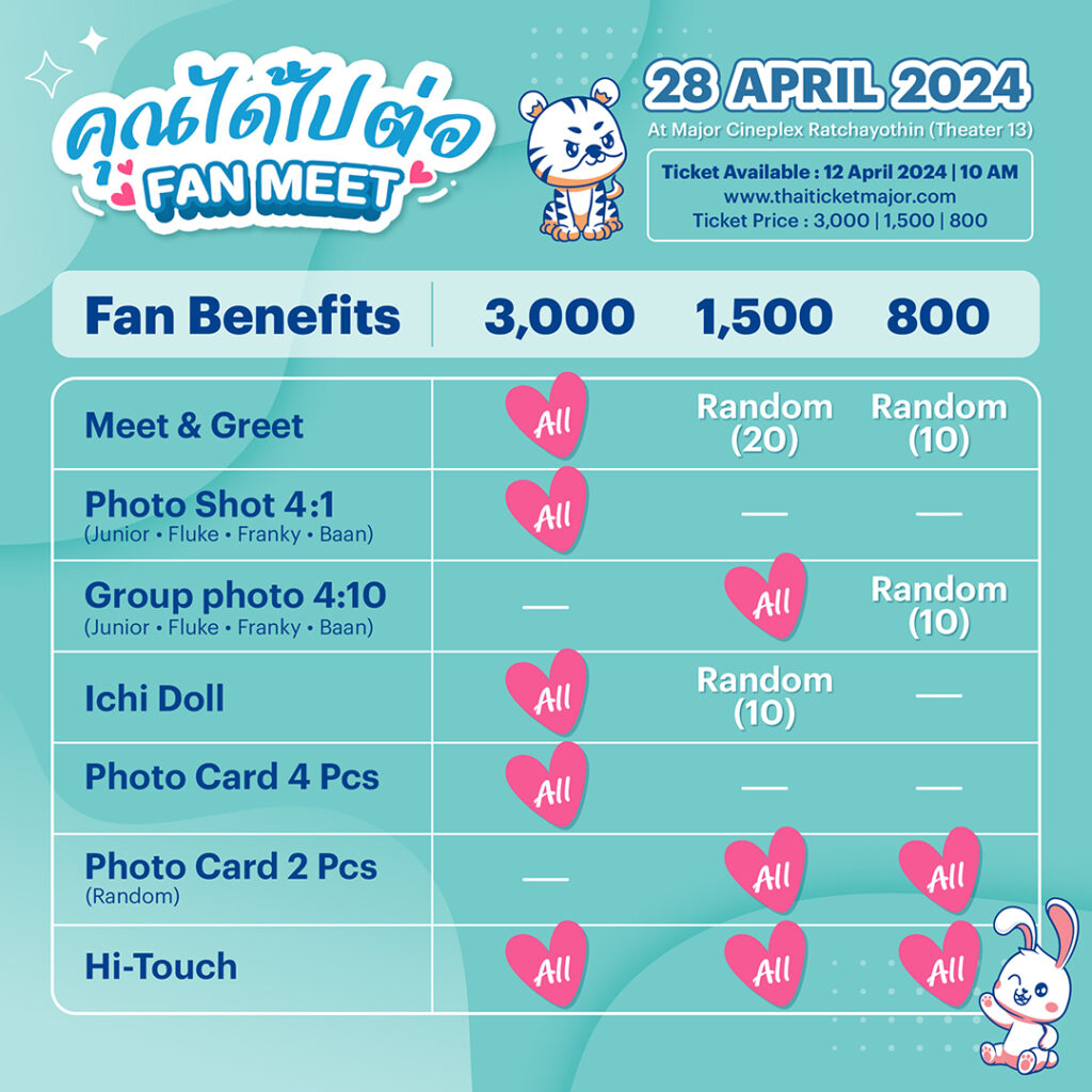 โดย “จูเนียร์-ฟลุ๊คจ์” มาการันตีโมเมนต์ความน่ารักในงานครั้งนี้ว่า “ต้องขอบคุณมาก ๆ เลยนะครับที่เป็นกำลังใจแล้วก็ให้การซัปพอร์ตพวกเราจนทำให้มีงานแฟนมีตในวันนี้ ดีใจมาก ๆ วันที่ 12 เมษายนนี้ เปิดให้กดบัตรกันแล้วนะครับ วอร์มนิ้วรอกันไว้ได้เลย มีบัตรตั้งแต่ราคา 3,000 1,500 และ 800 เลยครับ สำหรับใครที่กดบัตรทันเตรียมรับความฟินกลับบ้านกันได้เลยครับ ส่วนโชว์จะมีอะไรบ้างจะสนุกขนาดไหนต้องขออุบไว้ก่อนอยากเซอร์ไพรส์ให้ไปเห็นกันในวันงานมากกว่า แต่แอบสปอยล์ว่ามีโชว์บางอย่างที่ผมไม่เคยทำมาก่อนเลย”