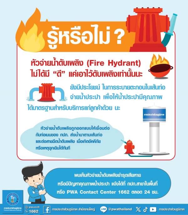 นายจักรพงศ์ คำจันทร์ รองผู้ว่าการ (ปฏิบัติการ 2) รักษาการแทนผู้ว่าการ กปภ. เปิดเผยว่า ขณะนี้เกิดเหตุอัคคีภัยขึ้นบ่อยครั้ง เนื่องจากประเทศไทยเผชิญกับปรากฏการณ์เอลนีโญรุนแรงส่งผลให้สภาพอากาศร้อนจัดอย่างต่อเนื่อง จึงได้กำชับให้ กปภ. 234 สาขาทั่วประเทศ เฝ้าระวังการเกิดอัคคีภัยในพื้นที่สำนักงานและสถานีผลิตน้ำอย่างใกล้ชิดไม่ให้กระทบต่อการให้บริการน้ำประปา ตามที่ได้มีฝึกซ้อมดับเพลิงและอพยพหนีไฟ เป็นประจำทุกปี รวมทั้งเตรียมความพร้อมให้ความช่วยเหลือหากเหตุอัคคีภัย โดยตรวจสอบสภาพหัวจ่ายน้ำดับเพลิง (Fire Hydrant) ในพื้นที่ทุกจุดให้อยู่ในสภาพสมบูรณ์พร้อมใช้งาน ประสานความร่วมมือกับหน่วยงานในท้องถิ่นทดสอบการทำงานของหัวจ่ายน้ำดับเพลิง และดูแลทำความสะอาดพื้นที่โดยรอบจุดติดตั้งเพื่อให้เจ้าหน้าที่ดับเพลิงนำท่อดับเพลิงเชื่อมต่อกับหัวจ่ายน้ำดับเพลิงได้ง่ายและสะดวก สามารถระงับอัคคีภัยได้ทันท่วงทีเป็นการลดความสูญเสียต่อชีวิตและทรัพย์สินของประชาชน ทั้งนี้ เพื่อป้องกันการเกิดเหตุอัคคีภัยกับบ้านเรือน ขอแนะนำให้ประชาชนเก็บวัสดุอุปกรณ์ที่ติดไฟง่าย อาทิ กระดาษ พลาสติก บรรจุภัณฑ์ที่บรรจุสารเคมีต่าง ๆ ไว้ในที่มิดชิด ไม่ให้ถูกแสงแดดหรือได้รับความร้อนเพราะอาจกลายเป็นเชื้อเพลิง และควรสังเกตจุดติดตั้งหัวจ่ายน้ำดับเพลิงที่มีอยู่ในชุมชนเพื่อให้สามารถแจ้งพิกัดแก่เจ้าหน้าที่ดับเพลิงได้อย่างรวดเร็วแม่นยำ โดยไม่นำสิ่งของมาวาง สร้างสิ่งปลูกสร้างหรือจอดรถกีดขวางบริเวณจุดติดตั้งหัวจ่ายน้ำดับเพลิง และหากพบเห็นหัวจ่ายน้ำดับเพลิงชำรุดเสียหาย สามารถแจ้งรายละเอียดเพื่อดำเนินการซ่อมแซมให้ใช้งานได้ตามปกติ