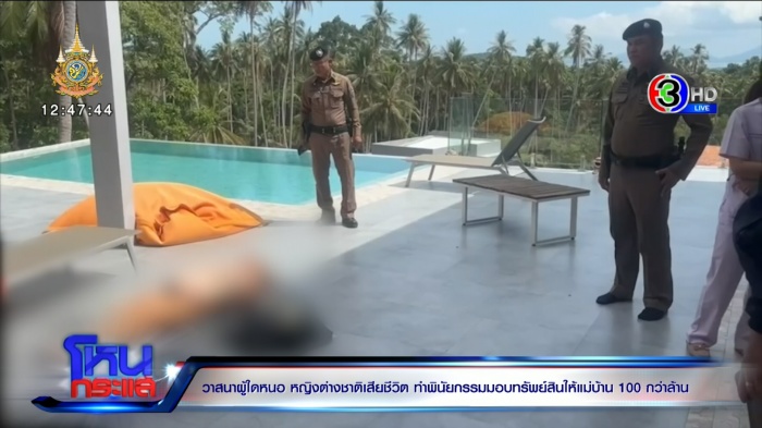 กรณีข่าวฮือฮา นักธุรกิจหญิงชาวฝรั่งเศส เจ้าของวิลล่าให้เช่าบนเกาะสมุย ได้จบชีวิตตัวเองด้วยการยิงตัวตาย ริมสระน้ำในวิลล่าหรู โดยก่อนตายหญิงรายดังกล่าวได้ทำพินัยกรรมยกทรัพย์สินมูลค่า 50 ล้านให้ “ป้าติ๋ม” แม่บ้านคนสนิท