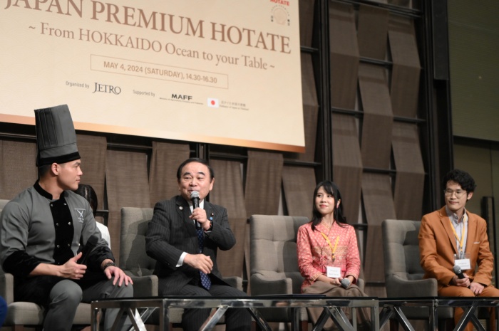 นายซากาโมโตะ เท็ตสึชิ รัฐมนตรีว่าการกระทรวงเกษตร ป่าไม้ และประมง ประเทศญี่ปุ่นได้ให้เกียรติมาร่วมงาน พร้อมพูดคุยกับเชฟอาร์ และอินฟลูเอนเซอร์ โดยกล่าวถึงจุดแข็งและเสน่ห์ของหอยเชลล์โฮตาเตะจากประเทศญี่ปุ่นว่า “เป็นวัตถุดิบที่มีความโดดเด่น มีเอกลักษณ์เฉพาะตัว สามารถนำไปปรุงเมนูใหม่ ๆ ให้เข้ากับอาหารหลากหลายสัญชาติ จึงอยากให้หอยเชลล์โฮตาเตะญี่ปุ่นเป็นที่นิยมรับประทานกันอย่างแพร่หลาย และสามารถขยายช่องทางการจำหน่ายออกไปยังพื้นที่นอกเหนือจากกรุงเทพฯ และปริมณฑลด้วย”