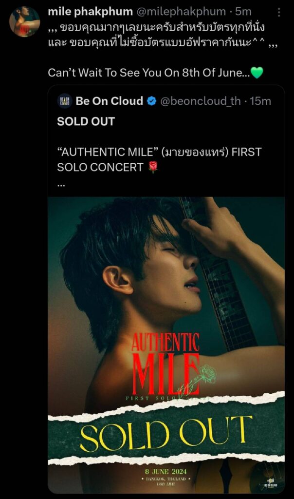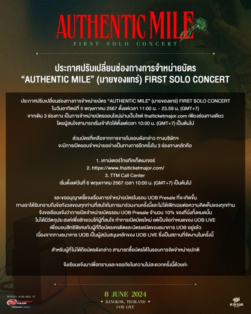 เรียกได้ว่าหมดไปแล้วอย่างรวดเร็วเมื่อช่วงเช้าที่ผ่านมา (5 พฤษภาคม 2024) สำหรับบัตร “AUTHENTIC MILE” (มายของแทร่) FIRST SOLO CONCERT ซึ่งนี่คือคอนเสิร์ตเดี่ยวครั้งแรกของมาย ภาคภูมิ ที่จะจัดขึ้นที่ UOB LIVE (Emsphere) ในวันที่ 8 มิถุนายน 2024 เวลา 18:00 น. นี้ โดยมีแฟน ๆ มาเข้าคิวรอซื้อนับแสนคนเลยทีเดียว