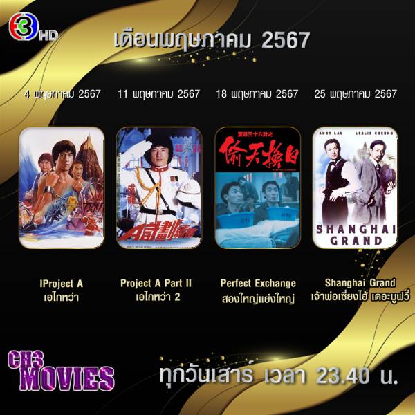 ส่งท้ายด้วย “แชนแนลทรีมูฟวี่ส์” ที่มาสร้างความสนุกทุกวันเสาร์ เวลา 23.40 น. เริ่มคืนแรกวันเสาร์ที่ 4 พฤษภาคม 2567 กับ เอไกหว่า (Project A) ต่อด้วยวันเสาร์ที่ 11 พฤษภาคม 2567 กับ เอไกหว่า 2 (Project A Part II) และ วันเสาร์ที่ 18 พฤษภาคม 2567 กับเรื่อง สองใหญ่แย่งใหญ่ (Perfect Exchange) ปิดท้ายด้วยวันเสาร์ที่ 25 พฤษภาคม 2567 กับ เจ้าพ่อเซี่ยงไฮ้ เดอะมูฟวี่ (Shanghai Grand)