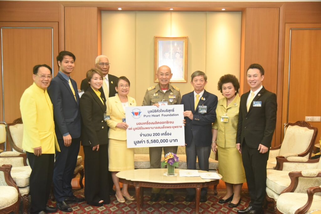 นางเธียรรัตน์ นะวะมะวัฒน์ ประธานมูลนิธิหัวใจบริสุทธิ์ กล่าวว่า สำหรับเครื่องผลิตออกซิเจนทางการแพทย์ที่ได้นำมามอบในครั้งนี้ ทางมูลนิธิหัวใจบริสุทธิ์ได้รับบริจาคจาก นางสาวกุลพรภัสร์ วงศ์มาจารภิญญา ที่ปรึกษาประธานเจ้าหน้าที่บริหาร กลุ่มพลังงานบริสุทธิ์ โดยเครื่องผลิตออกซิเจน มีขนาด 5 ลิตร จำนวน 200 เครื่อง