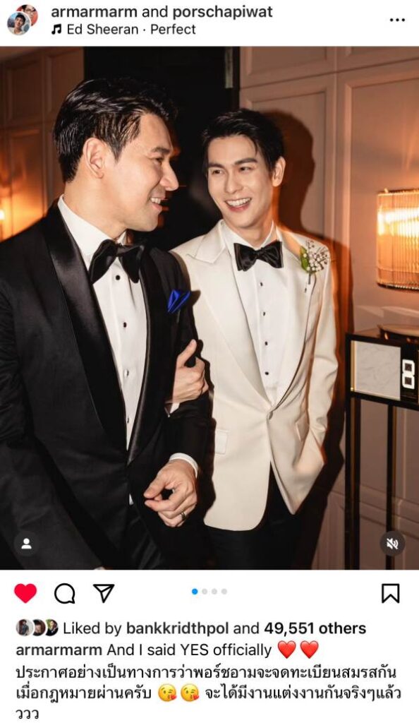 และดูเหมือนคู่รักในตำนาน พอร์ชอาม เจ้าของคลิป คุกเข่าขอแต่งงาน สุดโรแมนติก ที่เป็นไวรัลเมื่อ 10 ปีที่แล้ว หนึ่งในคู่รักที่แสดงจุดยืนให้สังคมไทยเปิดรับความแตกต่างด้านเพศสภาพและความหลากหลาย ก็พร้อมใจกันโพสต์คลิปและภาพ “Invite Collaborator” ร่วมกันผ่านอินสตาแกรม @armarmarm และ @porschapiwat พร้อมแคปชั่น … “And I said YES officially ประกาศอย่างเป็นทางการว่าพอร์ชอามจะจดทะเบียนสมรสกัน เมื่อกฎหมายผ่านครับ จะได้มีงานแต่งงานกันจริง ๆ แล้วววว” และ “เราจะแต่งงานกัน เร็ว ๆ นี้ 16 years of togetherness… 10 years after the proposal… 2 hearts are certain… IT IS TIME TO GET MARRIED OFFICIALLY”