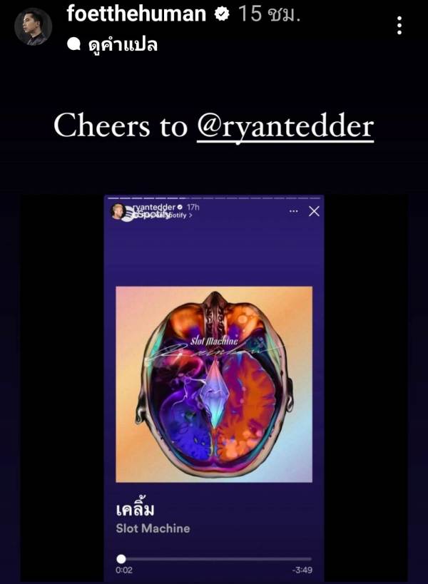 หลังจากที่เจ้าตัวได้ฟังบน Spotify ก็ได้โพสต์ลงในไอจีสตอรี่ส่วนตัว @Rayantedder ทำเอาวงร็อกเพอร์ฟอร์แมนซ์ระดับอินเตอร์ Slot Machine รู้แล้วถึงกับออกอาการดี๊ด๊าเป็นปลื้มสุด!!