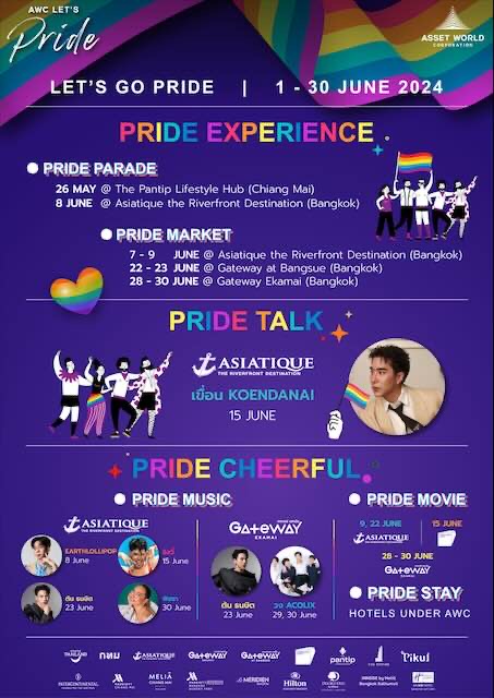 - Pride Experience การตกแต่งจุดหมายปลายทางการท่องเที่ยวและโครงการอสังหาริมทรัพย์ในเครือ AWC ให้มีสีสันของสายรุ้งที่มีชีวิตชีวา พร้อมจัดขบวนพาเหรดสะบัดธงสีรุ้งสุดตระการตาที่ จังหวัดเชียงใหม่ เส้นทางจากพุทธสถานเชียงใหม่ถึงลานประตูท่าแพ เมื่อวันที่ 26 พฤษภาคมที่ผ่านมา และที่โครงการเอเชียทีค เดอะ ริเวอร์ฟร้อนท์ เดสติเนชั่น วันที่ 8 มิถุนายนนี้ พร้อมด้วยกิจกรรมการแต่งกาย การแสดงเต้น และจุดถ่ายรูปอีกมากมาย รวมถึง Pride Market ที่ขนทัพสินค้ามาให้ทุกคนเลือกช้อปและเพลิดเพลินกับอาหารเครื่องดื่มนานาชนิด