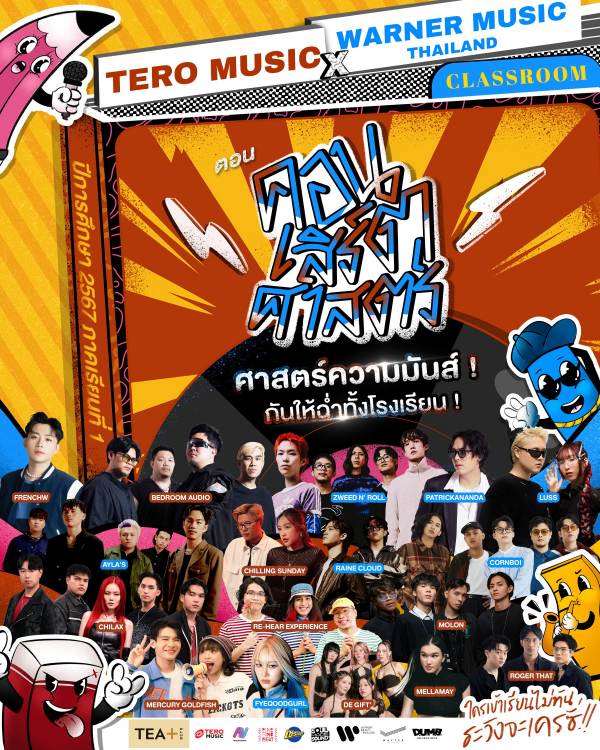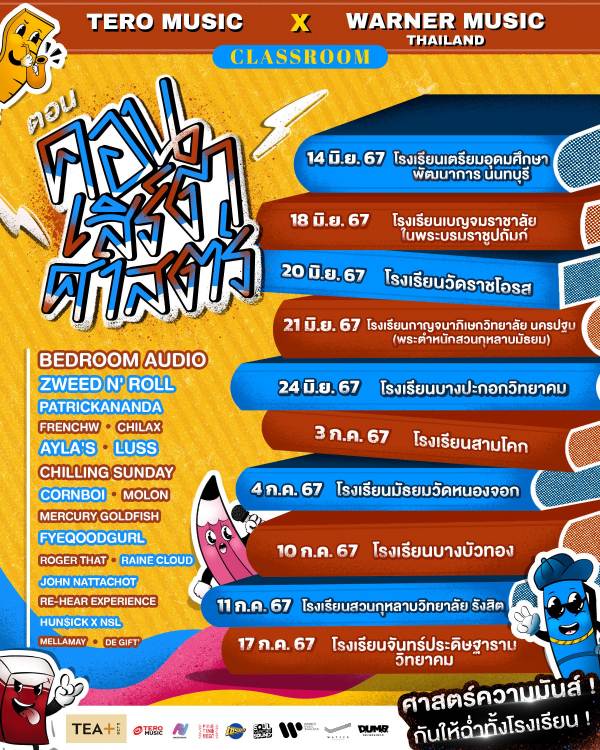 กลับมาตามคำเรียกร้องให้วัยรุ่น Gen Z ได้เฮกันลั่นโรงเรียนอีกครั้ง!! กับ “Tero Music X Warner Music Thailand Classroom ตอน คอนเสิร์ตศาสตร์” เปิดเทอมครั้งนี้…ทัพศิลปินตัวตึงจากค่าย Tero Music และ Warner Music Thailand ร่วมผนึกความมันส์ จัดเต็มวิชาพิเศษที่จะให้น้องๆ นักเรียนได้โดดกันให้สุด! ร้องกันให้หมดเสียง! บุกไปถึง10 โรงเรียนดัง … งานนี้บอกเลยใครเข้าเรียนไม่ทันระวังจะเครซี่!