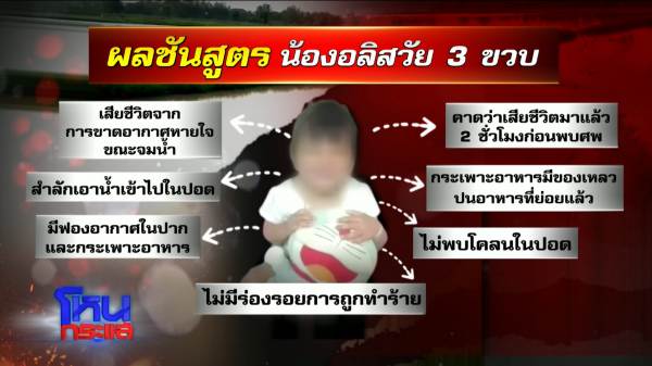 มีการไลน์หาย่าทิพย์ แล้วผ่านไปแค่ 8 นาที ผู้ใหญ่โทรไปบอกพ่อกับแม่ว่าเด็กหาย พ่อใช้เวลา 3 นาทีไปถึงศูนย์เด็กเล็ก ก็เจอร่างลูกแล้วพ่อบอกว่าแปลกมั้ยล่ะ ตอน 12.40 ยังหาไม่เจออยู่เลย พอ 12.50 น. บอกว่าไปดูร่างลูกตรงนั้น 10 นาทีที่ตามหาแล้วไปเจอ เด็กลอยอยู่ในน้ำ?