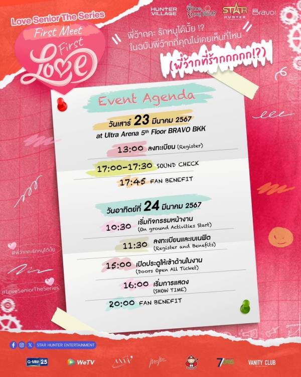 สำหรับแฟน ๆ ที่อยากจะมีโมเมนต์ดี ๆ ร่วมกับนักแสดงซีรีส์ Girl’s Love “พี่ว้ากคะ รักหนูได้มั้ย!?” (LOVE SENIOR THE SERIES) เหมือนชาวไทเป พลาดไม่ได้กับงานแฟนมีตติ้ง LOVE SENIOR THE SERIES 1ST FAN MEETING : LOVE SENIOR FIRST MEET FIRST LOVE ที่จะยกขบวนมาแจกความฟินกันแบบครบทีม! ในวันอาทิตย์ที่ 24 มีนาคม 2567 ตั้งแต่เวลา14.00 น. เป็นต้นไป ณ Ultra Arena Hall ชั้น 5 Bravo BKK พระราม 9 สามารถจองบัตรได้แล้วตั้งแต่วันนี้ผ่านทาง https://www.ticketmelon.com/starhunterent/love-senior-first-meet-first-love-fanmeet