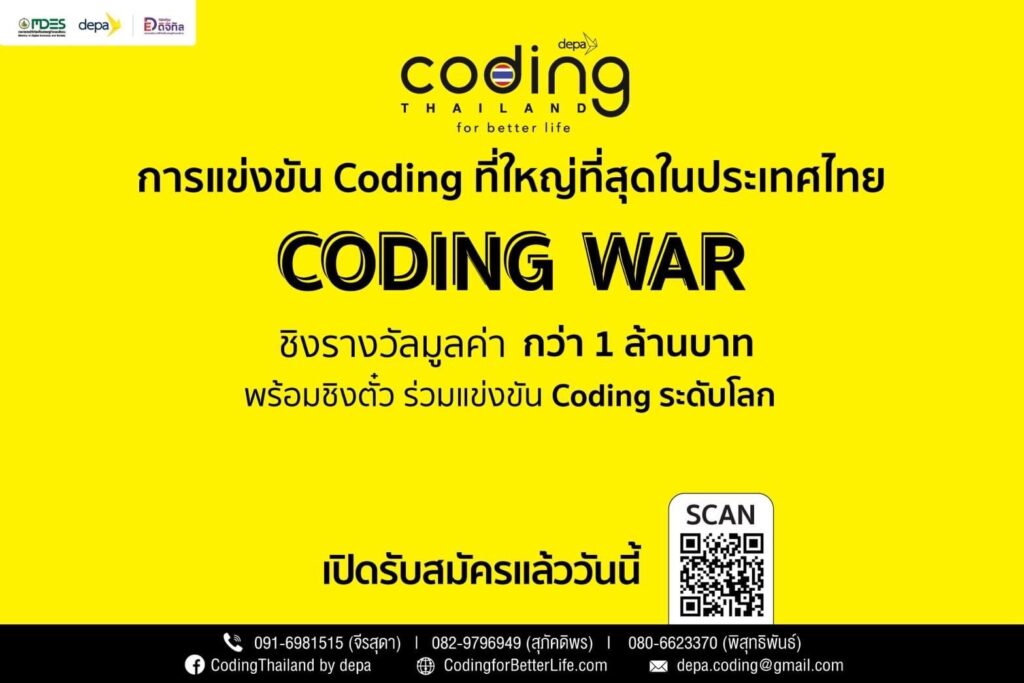 สำนักงานส่งเสริมเศรษฐกิจดิจิทัล (depa) ขอชวนน้อง ๆ นักเรียนระดับชั้นประถมศึกษาและมัธยมศึกษา พร้อมคุณครูผู้สอนจากสถาบันการศึกษาทั่วไทยร่วมประชันไอเดีย พร้อมสร้างสรรค์ผลงานด้านโค้ดดิ้งใน “Coding War” รายการแข่งขันทักษะด้านโค้ดดิ้งที่ยิ่งใหญ่ที่สุดในประเทศ อีกหนึ่งกิจกรรมที่ห้ามพลาดเป็นอย่างยิ่งของโครงการ Coding for Better Life สร้างรากฐานอนาคตประเทศไทย