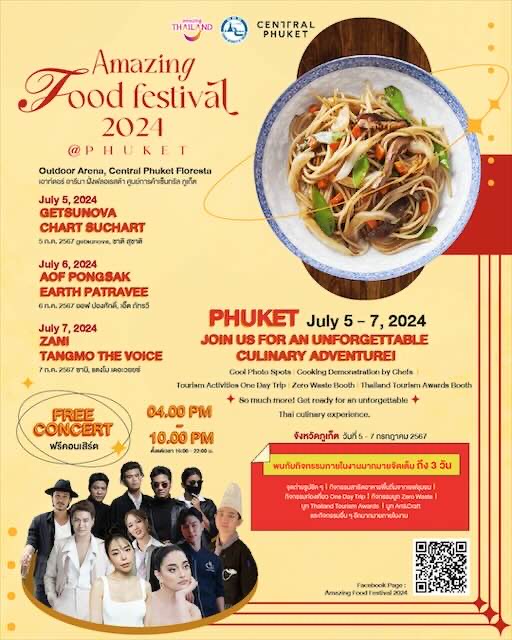 In “Amazing Food Festival 2024”; foodies, food lovers and social media tourists could update the taste of the deliciousness and varieties of many restaurants that have been carefully selected for this event. This will allow the experience of unique and outstanding food ingredients of various regions from all over Thailand. In each province, there is a highlight of different outstanding restaurants; such as MICHELIN GUIDE restaurants, famous restaurants with current popularity, contemporary restaurants, street food shops, popular local food shops, and famous shops from different regions. This also includes the decoration of the event area and photo area which brings the culture and famous ingredients of each province and each region to be famous landmarks. Apart from that, there will be demonstration of cooking activities by famous chefs, such as Chef Big Phuripat Jaiweerattanakul (The winner of Stars Chef Thailand), Chef Kao Vayo Nisatchanakan (Head of Cold kitchen Hilton Bangkok grand Asoke), and local chefs from Ban Bang Rong and Ban Bang Tao-Cherng Talay communities.There are also booths for Art & Craft and TTA (Thailand Tourism Awards) with the activities of inviting tourists to register via Facebook: Amazing Food Festival 2024, to experience One Day Trip in Ban Bang Rong communities that is the origin of Phuket’s food ingredients. With the increasement of fun through music performance for the people attending and enjoying 3 days concerts from various famous artists such as Chart Suchart, Getsanova, Earth Patravee, AofPongsak, Tangmo The Voice, Zani Nipaporn.