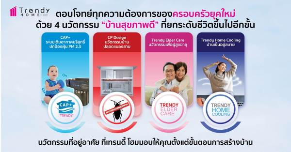 เทรนดี้ โฮม ยังมุ่งสร้างบ้านแห่งอนาคตที่ถูกเติมเต็มด้วยนวัตกรรมยกระดับการอยู่อาศัย เช่น ระบบเติมอากาศบริสุทธิ์ Cap+ ป้องกันฝุ่น PM 2.5 และเชื้อโรค, ระบบดูแลสุขาภิบาล บ้านปลอดแมลงสาบ CP Design, Trendy Elder Care นวัตกรรมสำหรับผู้สูงอายุ, Trendy Home Cooling บ้านเย็นอยู่สบาย เพื่อให้ลูกค้าได้รับความสะดวกสบายตั้งแต่วันแรกของการอยู่อาศัย เพื่อสร้างมั่นใจว่าลูกค้าที่สร้างบ้านกับเทรนดี้ โฮม จะได้อยู่ในสภาพแวดล้อมการอยู่อาศัยที่ดีต่อสุขภาพ สะดวกสบาย ครบครัน คุ้มค่า สร้างความพึงพอใจสูงสุดให้แก่ลูกค้าทั้งในวันนี้และในอนาคต พร้อมเพิ่มความครบครันด้วยการติดตั้งกลุ่มไฟดวงโคม Downlight, จุดติดตั้งเครื่องปรับอากาศและเครื่องทำน้ำอุ่น รวมถึงการให้บริการแบบ One Stop Service ที่ครอบคลุมตั้งแต่การเลือกแบบบ้านถึงการรับมอบบ้าน และการรับประกันหลังการอยู่อาศัย เพื่อให้คุณได้รับบริการที่สะดวกสบายในทุกด้าน ซึ่งสะท้อนโพสิชันนิ่ง ‘สร้างบ้านสวย คุณภาพสูง คุ้มค่าในระยะยาว สร้างที่ Trendy Home’ ตามแนวคิด “Trendy Home – Live in Trend” อย่างแท้จริง