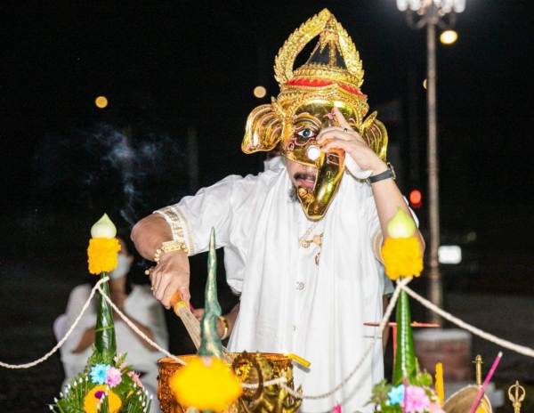 รวมถึงสร้างเศียรพระพิฆเนศและเศียรพ่อแก่ถวายวัดด้วย ซึ่งเราเป็นเจ้าพิธีบวงสรวงอยู่แล้ว เทพเจ้าที่เราเคารพศรัทธามากที่สุด ก็คือ พระพิฆเนศ และพ่อแก่ ซึ่งเราก็อยู่ในแวดวงบันเทิง ซึ่งบล็อกนี้ก็เป็นบล็อกที่ผมสั่งทำขึ้นมาคนแรกในประเทศไทย เพิ่งไปถวายหลวงปู่เมื่อวันที่ 2 กรกฎาคม ที่ผ่านมาก ตอนนี้เศียรพระพิฆเนศและเศียรพ่อแก่ที่ใหญ่ที่สุดในประเทศหรือในโลกอยู่ที่ธรรมะอุทยาน ประดับบารมีหลวงปู่มหาศิลา สิริจันโท เพื่อส่งเสริมการท่องเที่ยวของวัด หรือดึงดูดผู้คนเป็นกุศโลบายให้เดินทางมาท่องเที่ยวพักผ่อนหย่อนใจ มาทำบุญ