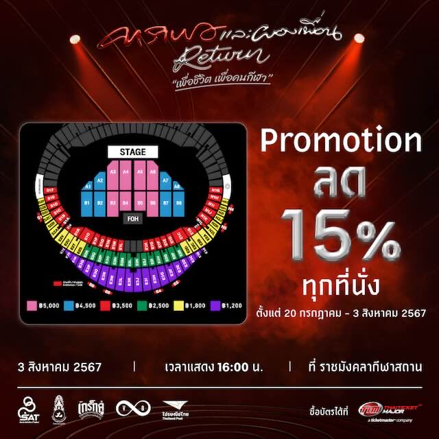 ราคา (บัตรนั่งทั้งหมด) 5000 / 4500 / 3500 / 2500 / 1800 / 1200 *พิเศษบัตรลดราคา 15% ทุกที่นั่ง และสามารถซื้อบัตรได้แล้วตั้งแต่วันเสาร์ที่ 20 ก.ค. 2567 เวลา 10.00 น. เป็นต้นไป ที่thaiticketmajor