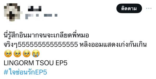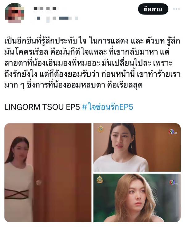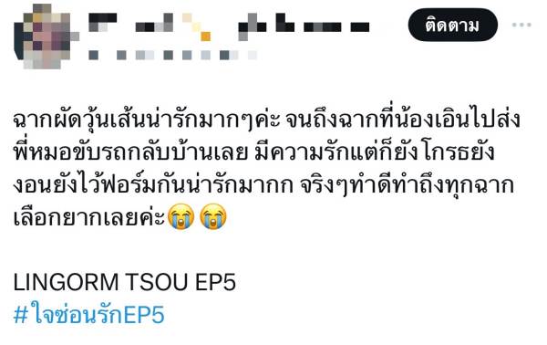 สร้างตำนานไม่หยุด สำหรับ “ใจซ่อนรัก” The Secret of Us ที่โกยกระแสตอบรับจากแฟน ๆ ทั้งชาวไทยและต่างชาติอย่างถล่มทลายในทุกสัปดาห์ ล่าสุดก็ยังคงตอกย้ำความปังไม่หยุด กับสกิลการแสดงที่เข้าถึงอารมณ์แบบจุก ๆ ของ ออม กรณ์นภัส และ หลิงหลิง คอง กับฉากดราม่ากลางโต๊ะอาหาร ทำมัมหมีปวดใจหนักก่อนรวมพลังส่งแฮชแท็ก #ใจซ่อนรักEP5 ครอง X อันดับ 1 เทรนด์โลก ไทย สิงคโปร์ เวียดนาม ไต้หวัน ฮ่องกง, อันดับ 2 มาเลเซีย, อันดับ 3 บราซิล และ ฟิลิปปินส์, อันดับ 8 ออสเตรเลีย ตามมาด้วย อินโดนีเซีย และ เม็กซิโก และถูกพูดถึงซีนอารมณ์ของทั้งหลิงหลิงและออมแบบตัวมัม ใน X มากกว่า 1 ล้านครั้ง!