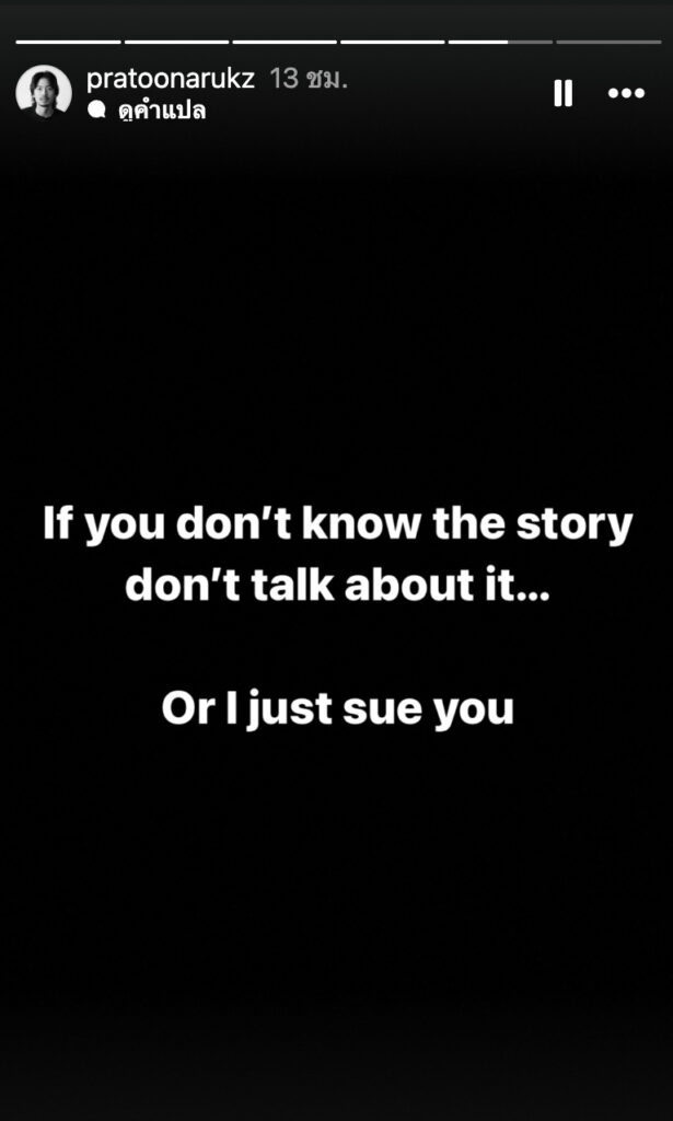 โดย หนุ่มทู โพสต์ข้อความไว้ว่า “If you don’t know the story don’t talk about it… Or I just sue you”