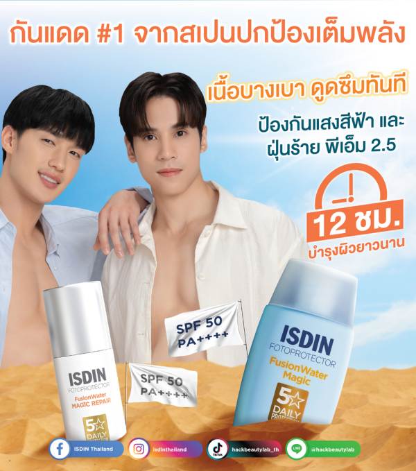 ISDIN – แบรนด์เวชสำอางอันดับ 1 จากสเปน ดึงสองหนุ่มหล่อผิวดีหน้าใส “เจษ – เจษฎ์พิพัฒ ติละพรพัฒน์” พระเอกหนุ่มหน้าคมมากความสามารถ และ “ตี๋-บุญยเกียรติ วงค์ษาแจ่ม” ดีกรีผู้รักษาประตูทีมชาติสุดหล่อขวัญใจชาวไทย มาเป็นพรีเซนเตอร์ผลิตภัณฑ์กันแดด “FusionWater MAGIC” ตอบโจทย์ไลฟ์สไตล์ของสองหนุ่มที่ต้องโดนแดดอย่างต่อเนื่อง พัฒนานวัตกรรมโดยทีมนักวิทยาศาสตร์ร่วมกับอดีตนักวิจัยจาก NASA ที่ไม่เพียงเข้าใจผิว แต่ยังเข้าใจรังสี UV อย่างลึกซึ้ง จึงออกแบบผลิตภัณฑ์กันแดดที่สามารถดูแลและป้องกันผิวได้อย่างครอบคลุม วางเป้าหมายก้าวขึ้นเป็นแบรนด์กันแดดและฟื้นฟูผิวเสียจากแสงแดด ถือเป็นแบรนด์ที่ขึ้นมาเป็น 1 ใน 3 แบรนด์ในใจชาวไทยภายใน 5 ปีทั้งนี้ ISDIN เตรียมส่งแคมเปญ “สู่ขอบฟ้าแห่งการดูแลผิว” ตีตลาดสกินแคร์ในเร็ว ๆ นี้