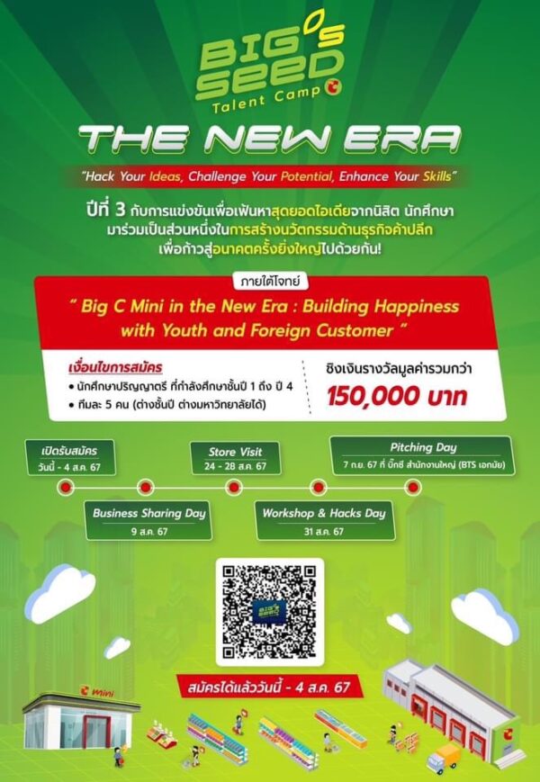 กลับมาอีกครั้งกับงาน Hackathon สุดปังจาก Big C BIG’s SEED Talent Camp 2024 The New ERA โอกาสครั้งใหญ่สำหรับนัศึกษา ชั้นปีที่ 1-4 ที่จะมาร่วมแชร์มีไอเดียสุดครีเอทีฟ ชิงเงินรางวัลกว่า 150,000 บาท