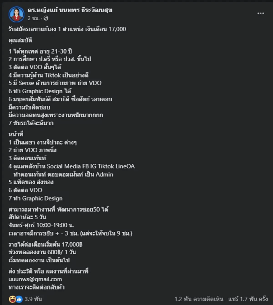 คอมเมนต์สนั่น! “หญิงแย้” ชี้แจงดราม่า หลังโพสต์รับสมัครเลขา เงินเดือน 17,000