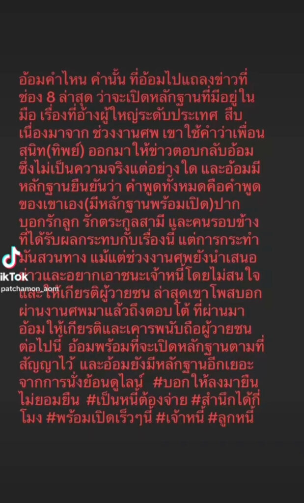 ล่าสุด อ้อม หนึ่งในเจ้าหนี้ที่ออกมาแถลงและแจ้งความ ได้โพสต์บอกว่า หลังจากนี้พร้อมจะเปิดหลักฐานตามที่สัญญาไว้ “อ้อมคำไหน คำนั้น ที่อ้อมไปแถลงข่าวที่ช่อง 8 ล่าสุดว่าจะเปิดหลักฐานที่มีอยู่ในมือ เรื่องที่อ้างผู้ใหญ่ระดับประเทศ สืบเนื่องมาจากช่วงงานศพ เขาใช้คำว่าเพื่อนสนิท (ทิพย์) ออกมาให้ข่าวตอบกลับอ้อม ซึ่งไม่เป็นความจริงแต่อย่างใด และอ้อมมีหลักฐานยืนยันว่า คำพูดทั้งหมดคือคำพูดของเขาเอง (มีหลักฐานพร้อมเปิด) ปากบอกรักลูก รักตระกูลสามี และคนรอบข้างที่ได้รับผลกระทบกับเรื่องนี้ แต่การกระทำมันสวนทาง แม้แต่ช่วงงานศพยังนำเสนอข่าวและอยากเอาชนะเจ้าหนี้โดยไม่สนใจและให้เกียรติผู้วายชนม์ ล่าสุดเขาโพสต์บอกผ่านงานศพมาแล้วถึงตอบโต้ ที่ผ่านมาอ้อมให้เกียรติและเคารพนับถือผู้วายชนม์ ต่อไปนี้อ้อมพร้อมที่จะเปิดหลักฐานตามที่สัญญาไว้ และอ้อมยังมีหลักฐานอีกเยอะ จากการนั่งย้อนดูไลน์ #บอกให้ลงมายืนไม่ยอมยืน #เป็นหนี้ต้องจ่าย #สำนึกได้กี่โมง #พร้อมเปิดเร็วๆนี้ #เจ้าหนี้ #ลูกหนี้”