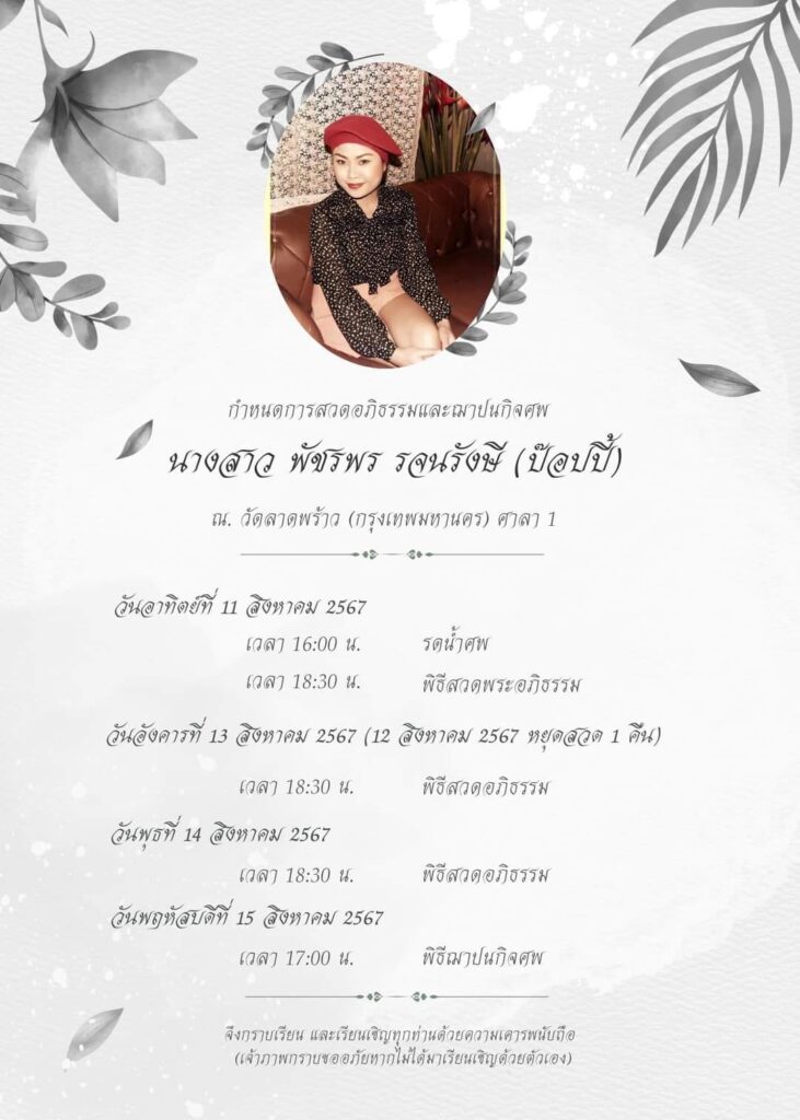 กำหนดการพิธีฌาปนกิจศพ น.ส.พัชรพร (ป๊อปปี้) รจนรังษี บุตรสาวคนกลางของ ดู๋ ดอกกระโดน