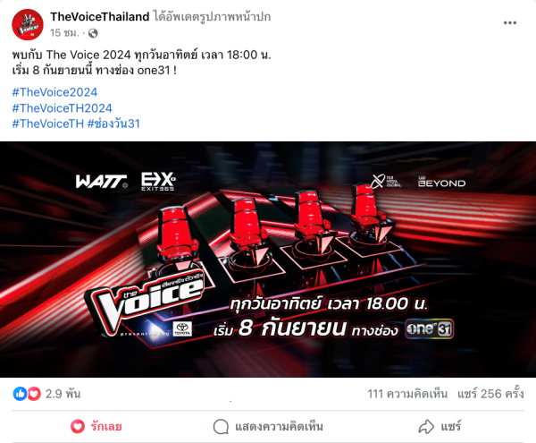 อย่าพลาด! ติดตามทุกความเคลื่อนไหวและความตื่นเต้นที่ทำให้หัวใจเต้นแรงในรายการ The Voice Thailand 2024 presented by Toyota ทุกวันอาทิตย์ เวลา 18.00 น. เริ่มวันอาทิตย์ที่ 8 กันยายนนี้ ทางช่องวัน 31 และสามารถติดตามข้อมูลข่าวสารทุกความเคลื่อนไหวของรายการ The Voice Thailand 2024 ได้ทุกช่องทางโซเชียลมีเดียของรายการ