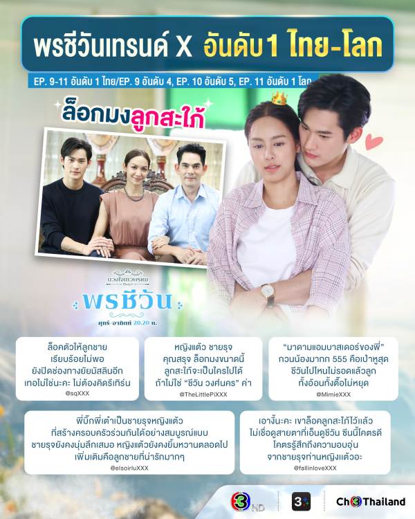 ปลุกกระแสแรงจนเป็นเรื่องทอล์กออฟเดอะทาวน์ของวงการละครไทยกันเลยทีเดียว สำหรับ ละครชุด “ดวงใจเทวพรหม” เรื่อง “พรชีวัน” ทางช่อง 3 เป็นปรากฏการณ์ความแรงที่ทำแฟน ๆ พูดถึงสนั่นโซเชียลทั้งในไทยและต่างประเทศ ไปกับอีพีล่าสุดที่พาแฮชแท็ก #พรชีวันEP9-11 ขึ้นเทรนด์ X อันดับ 1 ในไทย พุ่งแรงต่อเนื่อง 3 ตอนติด นอกจากนี้ยังส่ง อีพี 11 ทะยานติดเทรนด์โลก อันดับ 1 อย่างต่อเนื่อง กับความน่ารักของพระนางเคมีฉ่ำปอด อย่าง เก้า นพเก้า และ พีพี ปุญญ์ปรีดี ที่ทำแฟน ๆ ฟินไปทั่วบ้านทั่วเมือง