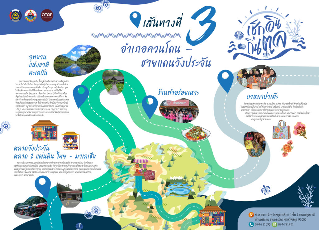 - เส้นทางที่ 3 อำเภอควนโดน – ชายแดนวังประจัน จะได้พบกับ ตลาดชายแดนวังประจัน ตลาด 2 แผ่นดินไทย – มาเลเซีย ,อุทยานแห่งชาติทะเลบัน (ทะเลสวย ที่ไม่ใช่ทะเลน้ำเค็ม) สินค้าวิสาหกิจชุมชนดาหลาปาเต๊ะ อาทิ กระเป๋า ,ผ้าบาติก และผ้ามัดย้อม