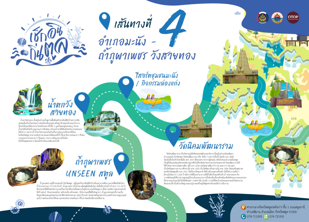 - เส้นทางที่ 4 อำเภอมะนัง – ถ้ำภูผาเพชร วังสายทอง จะได้พบกับ “Unseen สตูล” อาทิ ถ้ำภูผาเพชรที่เก่าแก่กว่า 450 ล้านปี ,น้ำตกวังสายทอง ,วัดนิคมพัฒนาราม