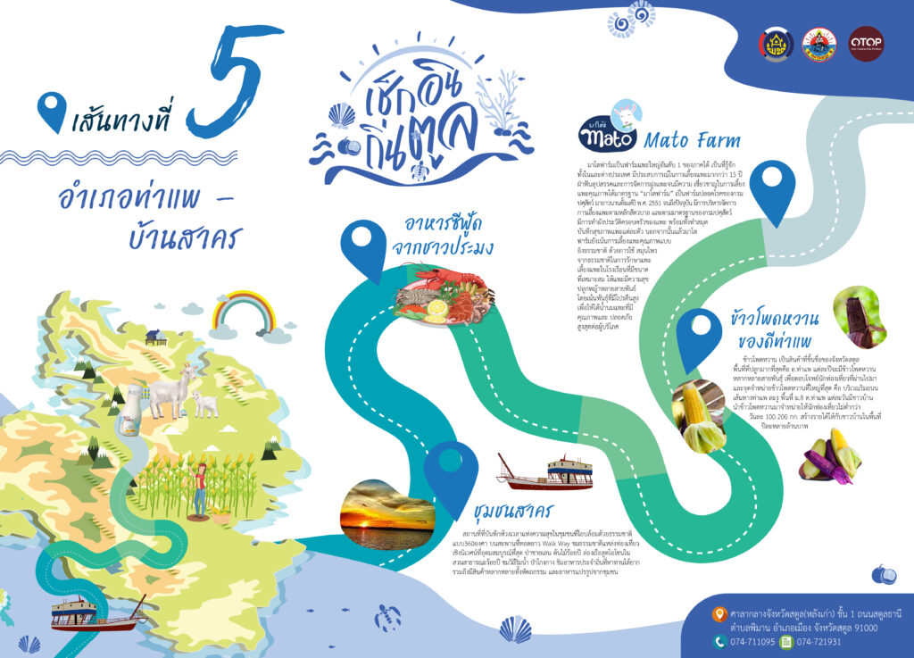 - เส้นทางที่ 5 อำเภอท่าแพ – บ้านสาคร จะได้พบกัน ชุมชนสาครที่โอบล้อมด้วยธรรมาติแบบ 360 องศา เป็นแหล่งท่องเที่ยวเชิงนิเวศที่อุดมสมบูรณ์ที่สุด