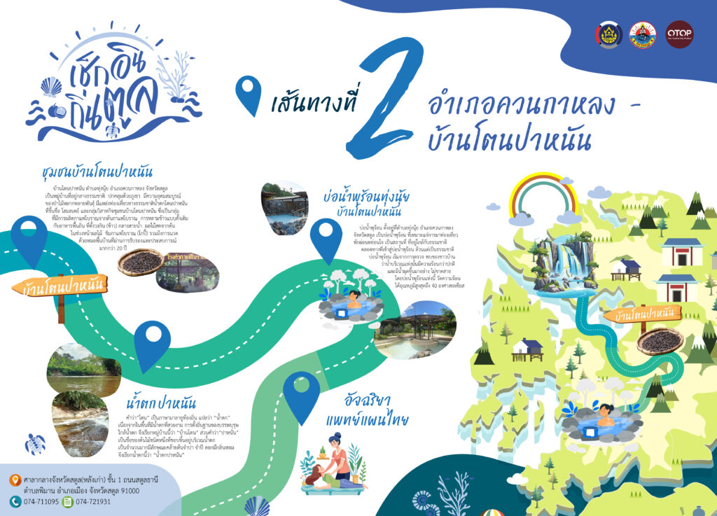 - เส้นทางที่ 2 อำเภอควนกาหลง – บ้านโตนปาหนัน ซึ่งจะได้พบกับ ชุมชนบ้านโตนปาหนัน ,บ่อน้ำพุร้อนทุ่งนุ้ย บ้านโตนปาหนัน
