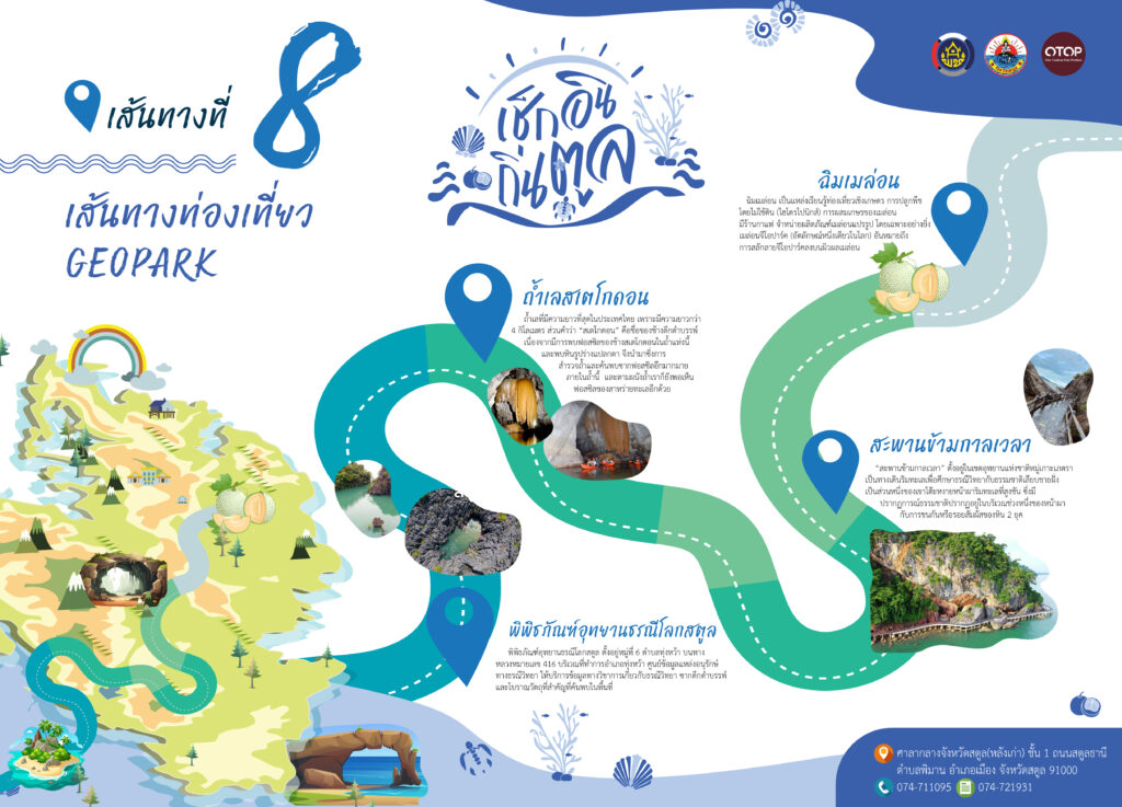 - เส้นทางที่ 8 เส้นทางท่องเที่ยว GEOPARK จะได้พบ พิพิธภัณฑ์อุทยานธรณีโลกสตูลนำเสนอข้อมูลทางวิชาการเกี่ยวกับธรณีวิทยา ,ซากดึกดำบรรพ์ และโบราณวัตถุในพื้นที่ ,ถ้ำเลสเตโกดอน เป็นถ้ำเลที่มีความยาวที่สุดในประเทศไทย มีความยาวกว่า 4 กิโลเมตร ในถ้ำมีหินรูปร่างแปลกตา ,ซากฟอสซิลที่มีอายุประมาณ 500 ล้านปี เหมาะสำหรับคนชอบท่องเที่ยวแบบ อเวนเจอร์ส และรักธรรมชาติ ,สะพานข้ามกาลเวลา เป็นทางเดินริมทะเลเพื่อศึกษาธรณีวิทยากับธรรมชาติเลียบชายฝั่ง ที่มีช่วงหนึ่งของหน้าผาที่ชนกันของหิน 2 ยุค คือ ยุคแคมเบรียน (542 – 488 ล้านปี) กับยุค ออร์โดวิเชียน (488 – 444 ล้านปี) และฉิมเมล่อน เป็นแหล่งเรียนรู้ท่องเที่ยวเชิงเกษตร การปลูกพืชโดยไม่ใช้ดิน การผสมเกสรของเมล่อน โดยเฉพาะอย่างยิ่ง เมล่อนจีโอปาร์คบนพื้นผิวเมล่อน (อัตลักษณ์หนึ่งเดียวในโลก)