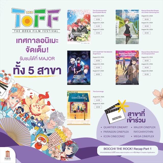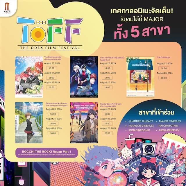 บริษัท เมเจอร์ ซีนีเพล็กซ์ กรุ้ป จำกัด (มหาชน)ร่วมกับ บริษัท อิออน ธนสินทรัพย์ (ไทยแลนด์) จำกัด (มหาชน) จัดเทศกาลสัปดาห์ภาพยนตร์ญี่ปุ่น “THE ODEX FILM FESTIVAL” ซึ่งปีนี้กลับมาอย่าง มีสีสัน คัดสรรหนังคุณภาพ 6 เรื่องหลากหลายแนวมาให้คนรักหนังอนิเมะได้เลือกชม ตั้งแต่วันที่ 21–27 สิงหาคมนี้ ที่โรงภาพยนตร์ 5 สาขา คือ โรงภาพยนตร์ควอเทียร์ ซีเนอาร์ต,พารากอน ซีนีเพล็กซ์, ไอคอน ซีเนคอนิค, เมกา ซีนีเพล็กซ์ และ เมเจอร์ ซีนีเพล็กซ์ รัชโยธิน บัตรราคาเริ่มต้น 180 บาท