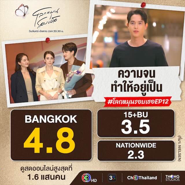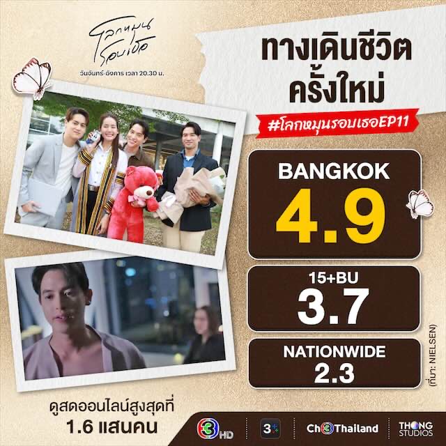 เรตติ้งสองอีพีล่าสุดพุ่งขึ้นอีกครั้ง โดย “โลกหมุนรอบเธอ ep.11” ที่ทุกคนต่างมีทางเดินชีวิตครั้งใหม่ ในเส้นทางความฝันของตัวเองก็คว้าเรตติ้งกลุ่มผู้ชมกรุงเทพฯนิวไฮไป 4.9 ทางด้านเรตติ้งกลุ่มผู้ชมอายุ 15 ปี ขึ้นไป หรือ กลุ่ม 15 BU+ (Bangkok and Urban) คว้าไป 3.7และเรตติ้งทั่วประเทศได้ไป 2.3 ขณะที่ “โลกหมุนรอบเธอ ep.12” ต้อนรับฉากแซ่บของมานะที่ช่วยปลุกความมั่นใจให้นารินทำเอาเรตติ้งกลุ่มผู้ชมกรุงเทพฯ คว้าไป 4.8 ส่วนเรตติ้งลุ่มผู้ชมอายุ 15 ปี ขึ้นไป หรือ กลุ่ม 15 BU+ (Bangkok and Urban) อยู่ที่ 3.5 และเรตติ้งทั่วประเทศได้ไป 2.3