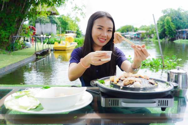 จวบจนใกล้เที่ยงก็ได้เวลาเดินทางกลับมากินหมูกระทะระดับโลกสูตรน้ำจิ้มแจ่วแบบไทย ๆ ในบรรยากาศริมคลองมหาสวัสดิ์ ณ ร้านบังกะโล ริเวอร์ ภายในบริเวณเดอะศาลายา เลเชอร์ ปาร์ค ย่างไป จุ่มไป กินลมชมวิวกันไป สบายอารมณ์ เรียกได้ว่าวันเดย์ทริปครั้งนี้ ทั้งกินทั้งเที่ยวเฟี้ยวเงาะสุด ๆ ส่วนสนนราคาแพคเกจเพียงท่านละ 555 บาทเท่านั้น แนะนำว่าควรโทรไปจองทริปไว้ล่วงหน้าก่อน…ดีที่สุด