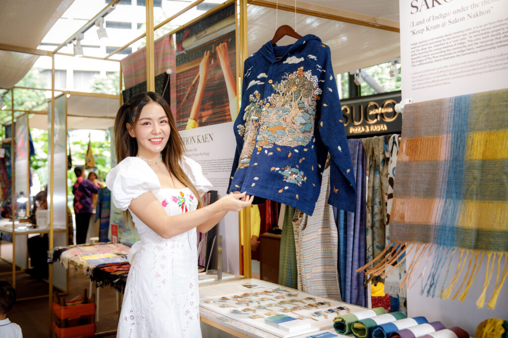 - 3. จังหวัดขอนแก่น (แดนมัดหมี่) จัดแสดงภายใต้แนวคิด “Circular Phuvieng” ผ้ามัดหมี่ร่วมสมัยจากแนวคิดเศรษฐกิจหมุนเวียนซึ่งจังหวัดขอนแก่นสามารถลดการนำเข้าวัตถุดิบใหม่และหันมาใช้ทรัพยากรที่มีอยู่แล้วให้เกิดประโยชน์สูงสุดเศษเส้นไหมมากมายจากการทอผ้าถุงถูกนำมาออกแบบเทคนิคการทอใหม่เกิดเป็นลายใหม่ที่แลดูคล้ายการทับซ้อนของชั้นหินฟอสซิลในอุทยานธรณีภูเวียงประสานกับการจับคู่สีทำให้ดูร่วมสมัยเกิดเป็นผืนผ้าที่นำไปต่อยอดเป็นสินค้าอื่นๆได้อีกมากมาย