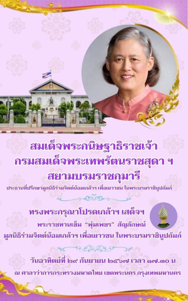 สมเด็จพระกนิษฐาธิราชเจ้า กรมสมเด็จพระเทพรัตนราชสุดา ฯ สยามบรมราชกุมารี ประธานที่ปรึกษามูลนิธิร่วมจิตต์น้อมเกล้า ฯ เพื่อเยาวชน ในพระบรมราชินูปถัมภ์ ทรงรับเชิญเสด็จพระราชดำเนินไปพระราชทานเข็ม “พุ่มเพชร” สัญลักษณ์ของมูลนิธิ ฯ แก่ผู้ว่าราชการจังหวัด ที่ดำรงตำแหน่งเป็นครั้งแรก ในฐานะประธานคณะกรรมการทุนการศึกษาของมูลนิธิ ฯ ประธานแม่บ้านมหาดไทยจังหวัด ที่ดำรงตำแหน่งเป็นครั้งแรก ในฐานะประธานคณะกรรมการอุปการะเยาวชนประจำจังหวัดของมูลนิธิ ฯ และประธานคณะกรรมการอุปการะเยาวชนประจำกรุงเทพมหานคร ผู้เป็นกำลังสำคัญในการปฏิบัติหน้าที่ให้มูลนิธิ ฯ ในวันอาทิตย์ที่ ๒๙ กันยายน ๒๕๖๗ เวลา ๑๗.๓๐ น. ณ ศาลาว่าการกระทรวงมหาดไทย เขตพระนคร กรุงเทพมหานคร ฯ