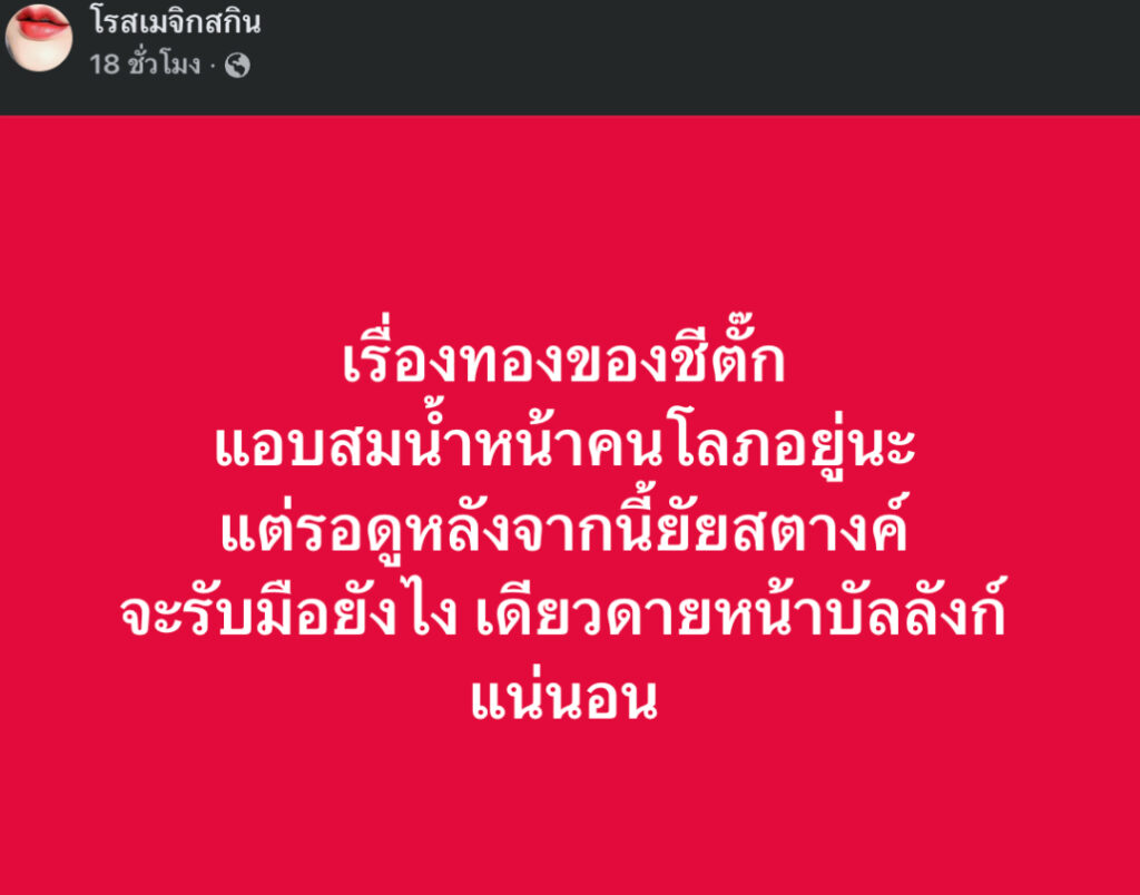 หลังจากเพจดังโพสต์ข้อความไว้ว่า “เรื่องทองของชีตั๊ก แอบสมน้ำหน้าคนโลภอยู่นะ แต่รอดูหลังจากนี้ยัยสตางค์ จะรับมือยังไง เดียวดายหน้าบัลลังก์แน่นอน”